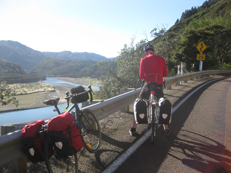 First sight of the ocean. We’ll be following the coastline all the way around the East cape for the next week. Slow start today with Chris having a flat in the first kilometre and then also managing to fall off his bike when coming to a stop. Our supposed 8am start ended up being closer to 11am with several coffees under our belt.